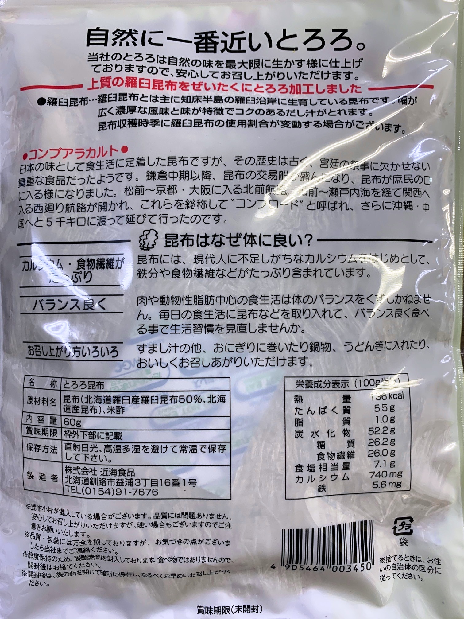 鉄分や食物繊維が豊富でカルシウムは普通牛乳の6.7倍も含まれており、化学調味料、甘味料を使用しない無添加のとろろ昆布です。